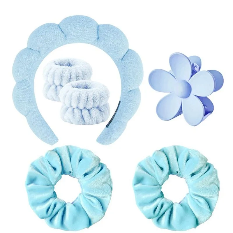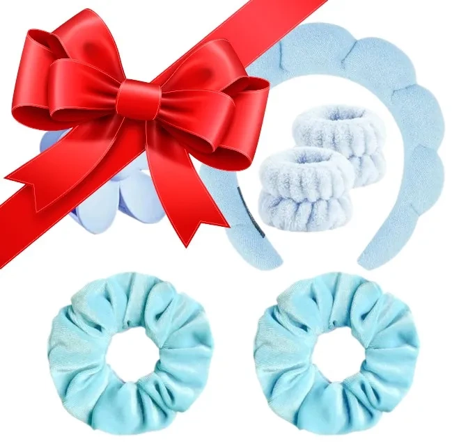 Ten zestaw akcesoriów w uroczym, jasnoniebieskim kolorze został stworzony z myślą o ułatwieniu codziennej pielęgnacji i zabiegów kosmetycznych. Dzięki niemu każda rutyna pielęgnacyjna stanie się bardziej komfortowa i efektywna. Opaska na głowę: Miękka, elastyczna opaska zapewnia wygodę i doskonałe dopasowanie, idealnie przytrzymując włosy z dala od twarzy podczas mycia, aplikacji maseczek czy makijażu. Frotki do włosów: Dwie frotki wykonane z delikatnego materiału, który nie niszczy włosów. Zapewniają pewne utrzymanie kucyków lub koków, nie pozostawiając odcisków na włosach. Klips do włosów w kształcie kwiatu: Stylowy i praktyczny klips do włosów w kształcie kwiatu, który nie tylko przytrzymuje włosy, ale także dodaje uroku każdej fryzurze. Opaski na nadgarstki: Dwie miękkie opaski na nadgarstki, które zapobiegają spływaniu wody podczas mycia twarzy. Wykonane z chłonnego materiału, łatwe w użyciu i czyszczeniu.