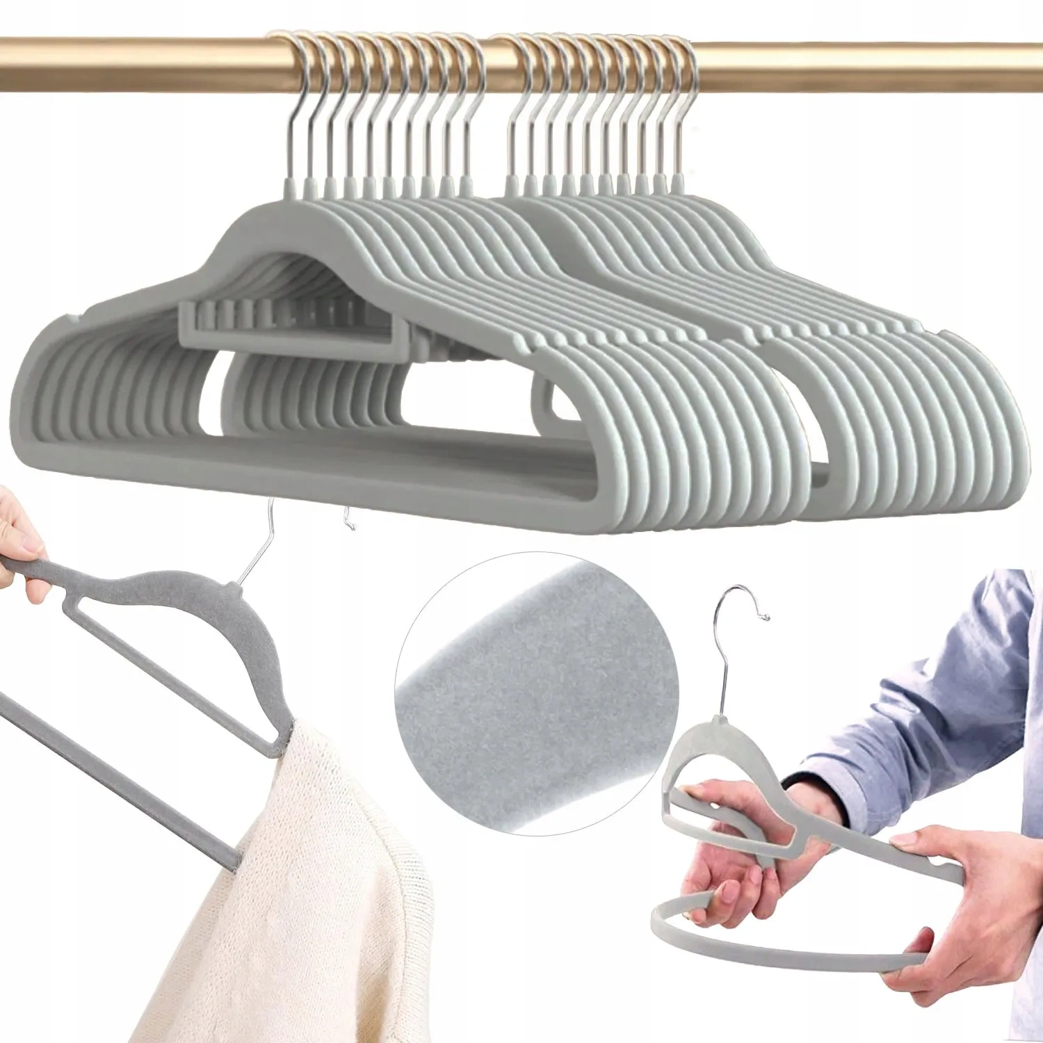 Zestaw 40 eleganckich wieszaków premium pokrytych delikatnym welurem w kolorze szarym.