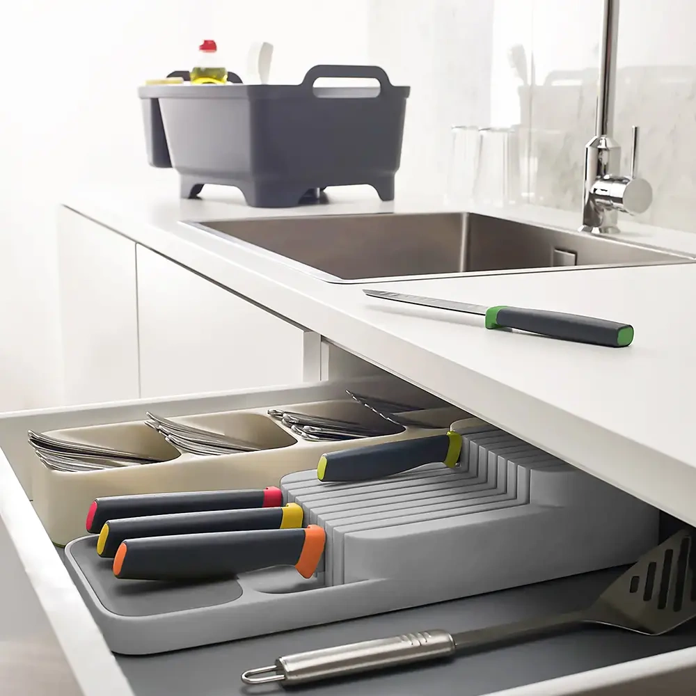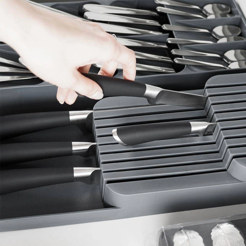 Stosowanie wkładki na noże kuchenne ułatwi utrzymać schludny wygląd wewnątrz szuflady.