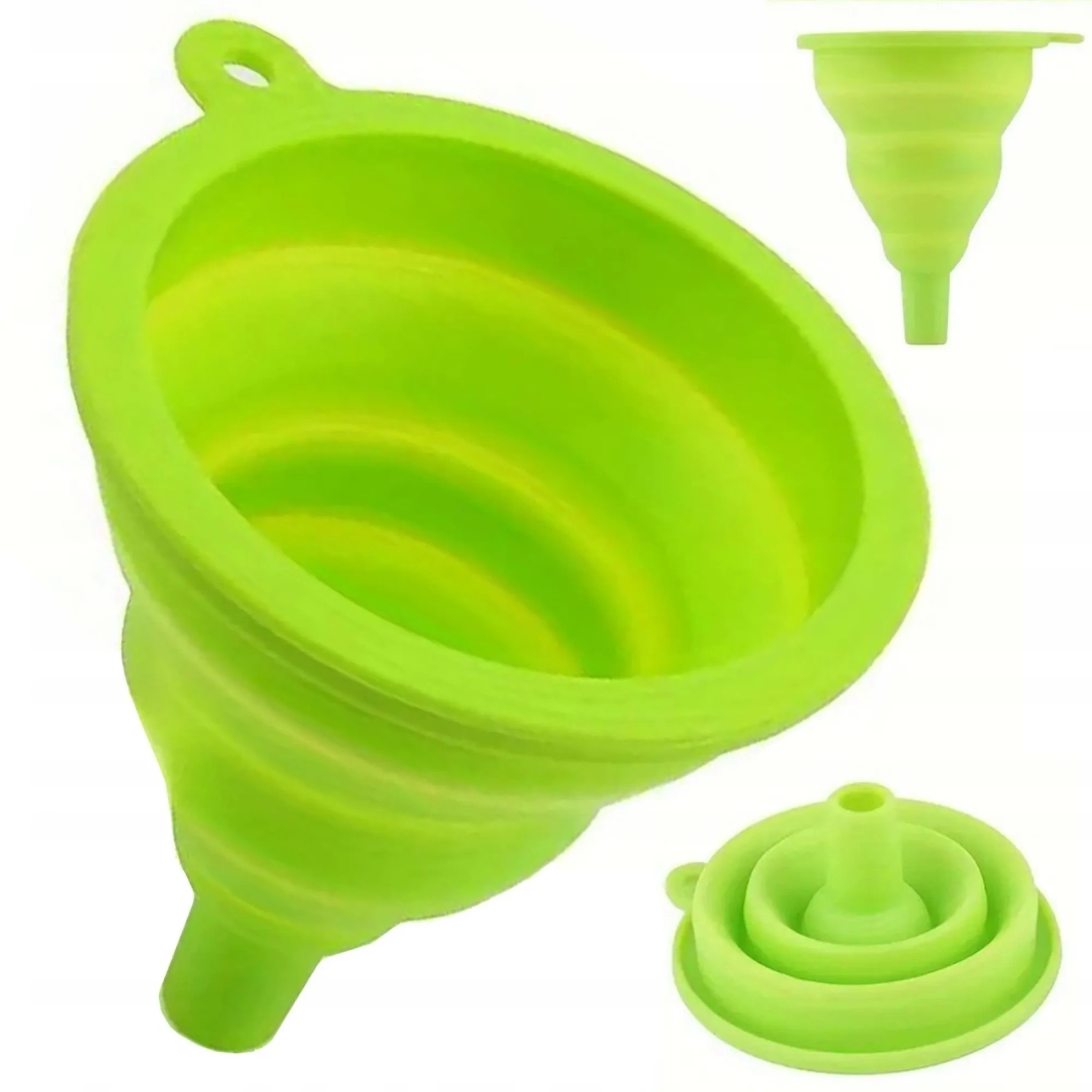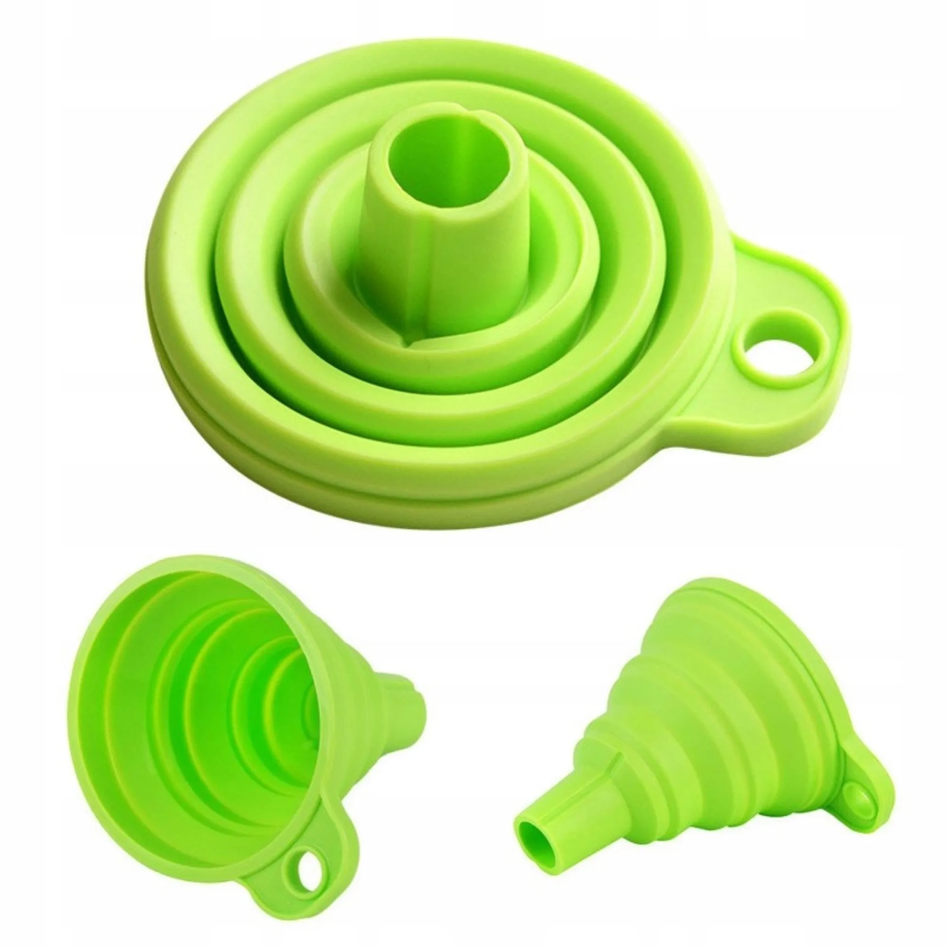 Elastyczny materiał ułatwia dopasowanie lejka do różnych naczyń, a jego zielony kolor dodaje estetyki kuchennym akcesoriom.