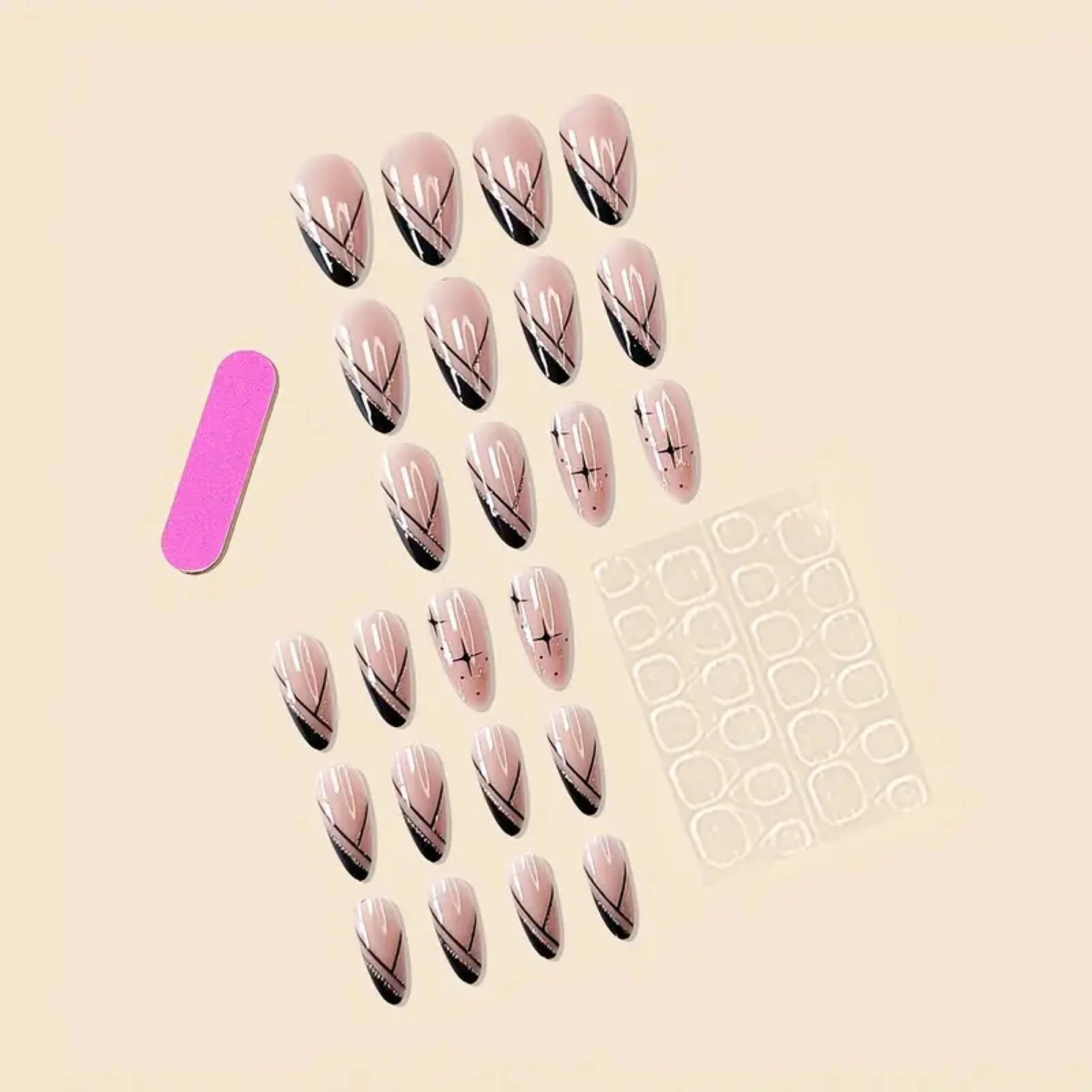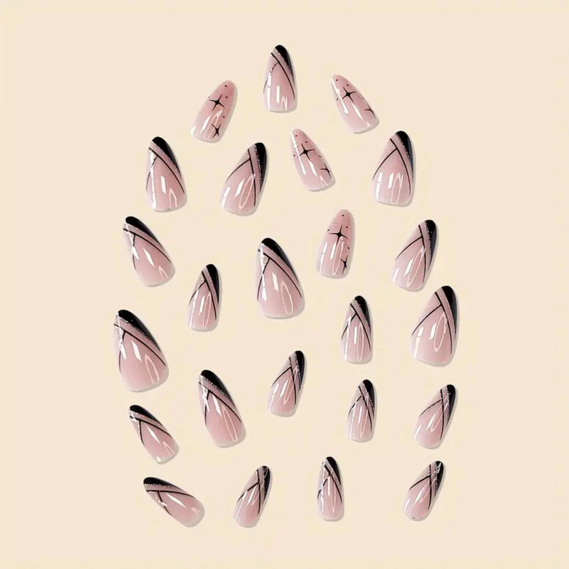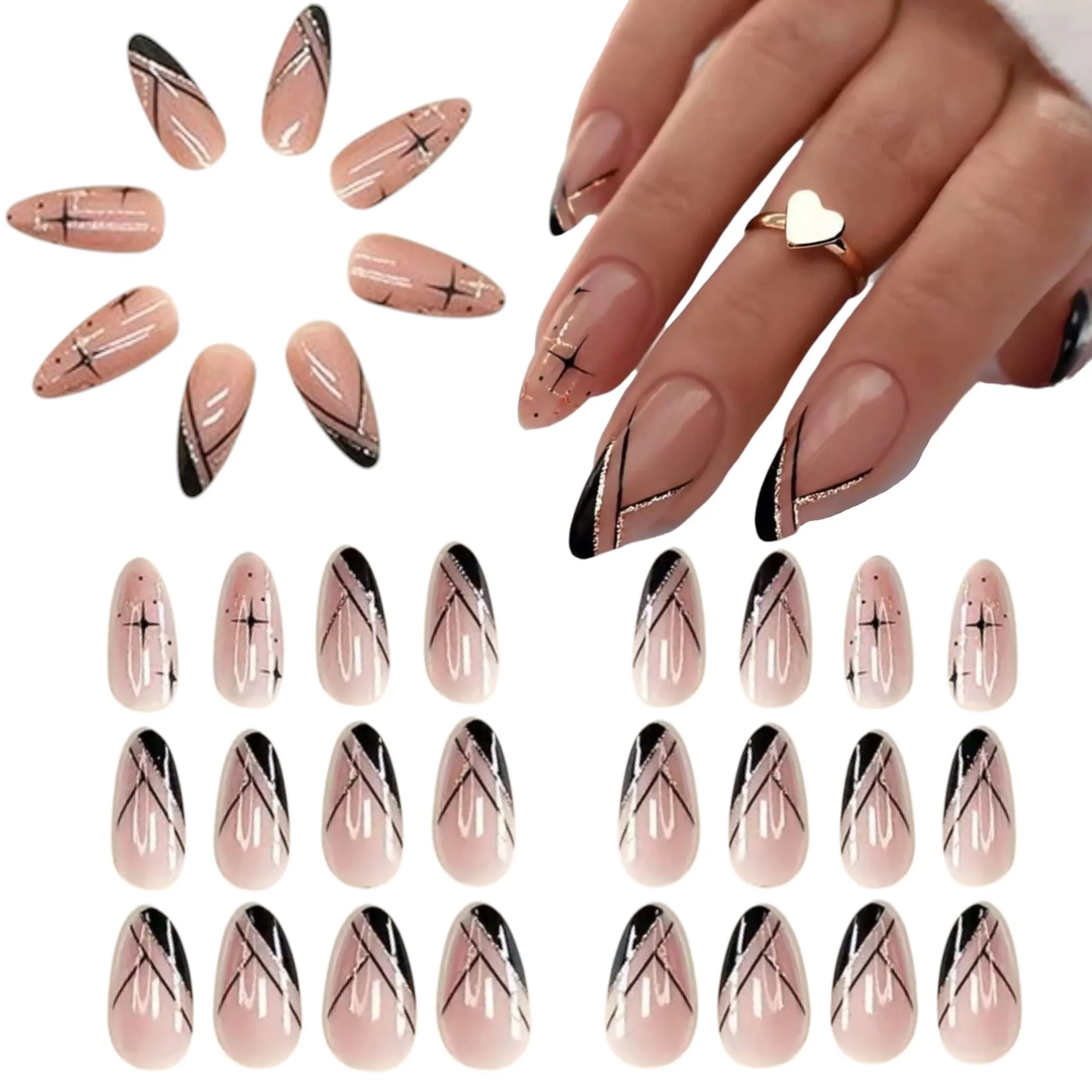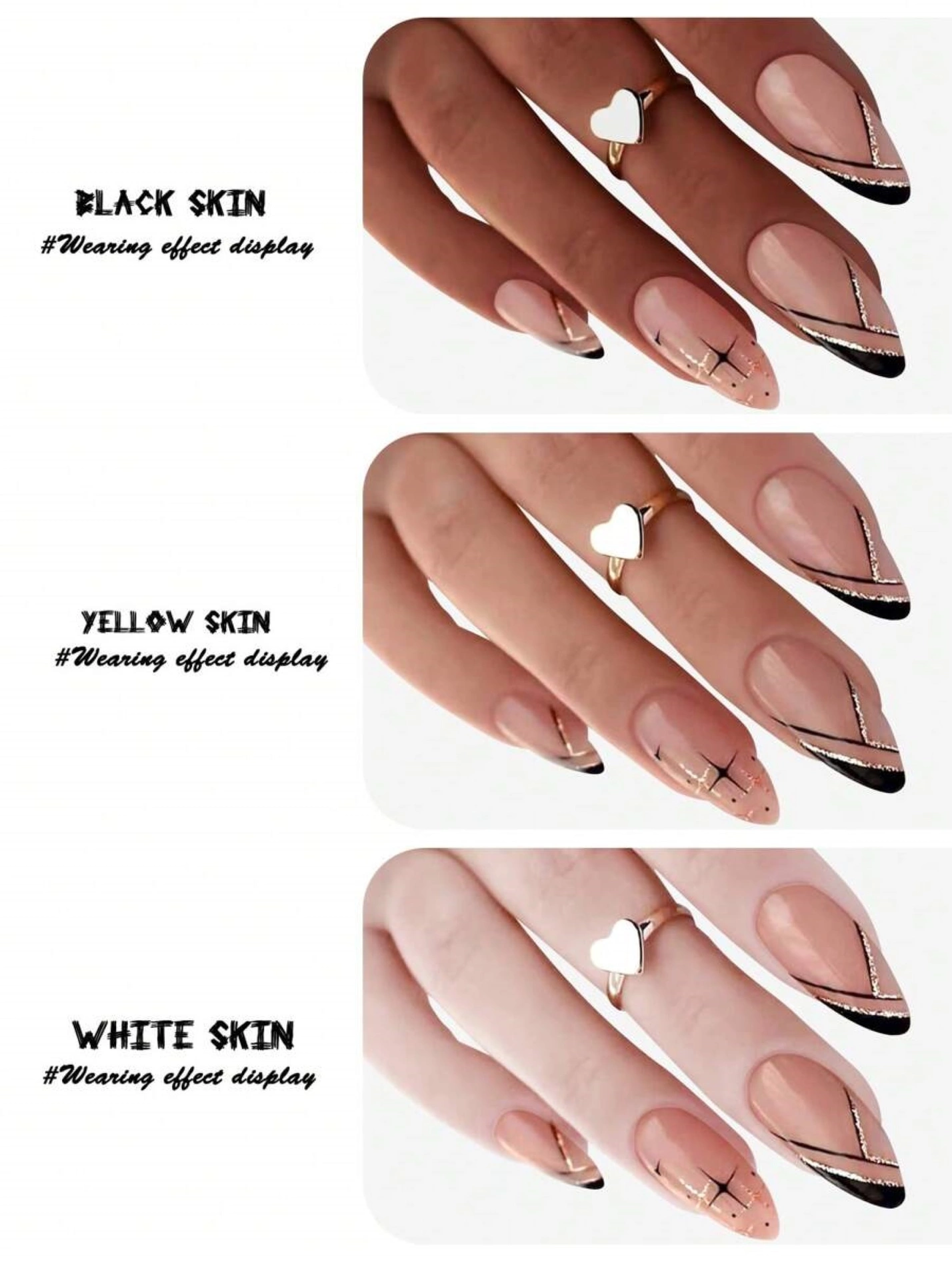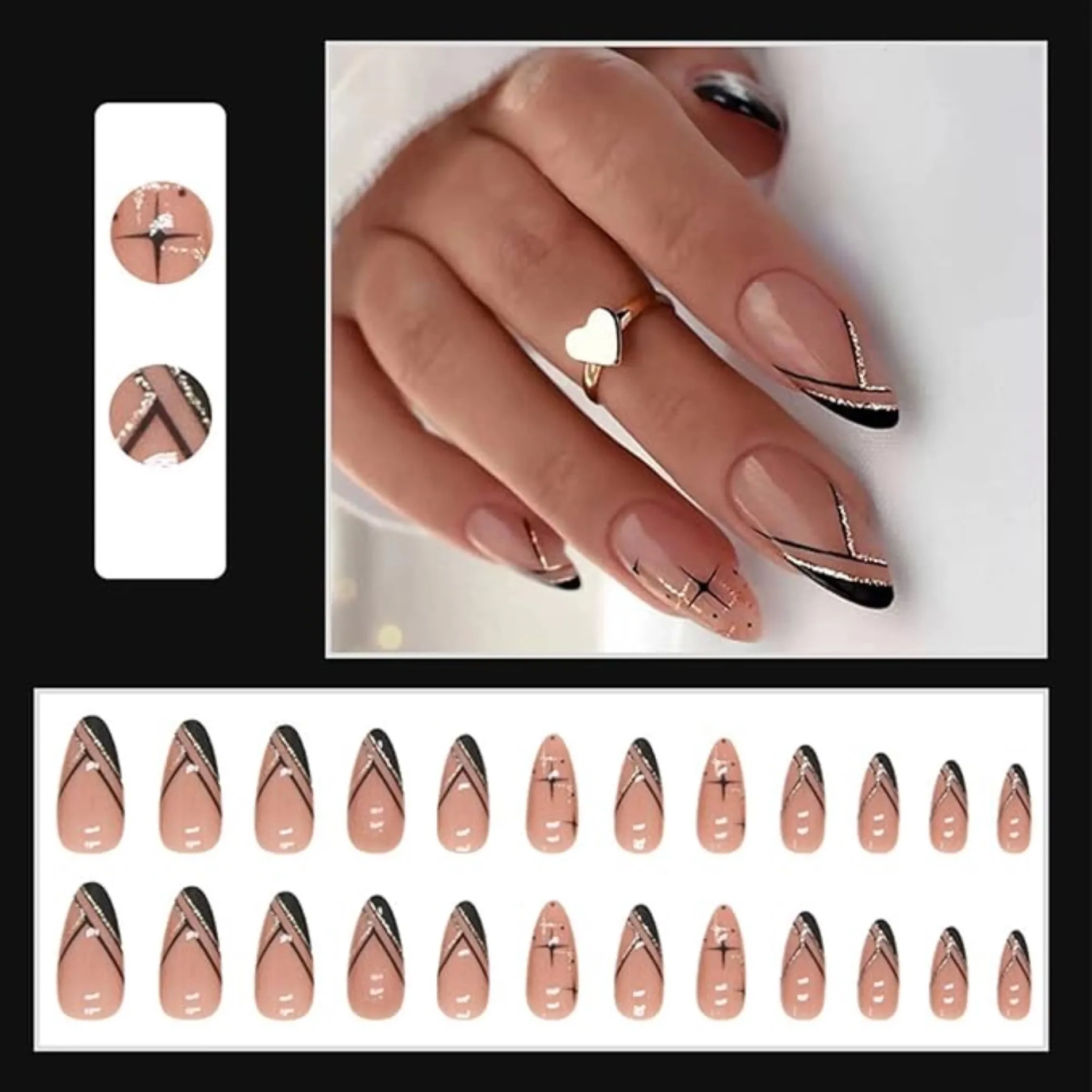 Wysokiej jakości zestaw tipsów do paznokci u rąk w czarno - złotym kolorze.
