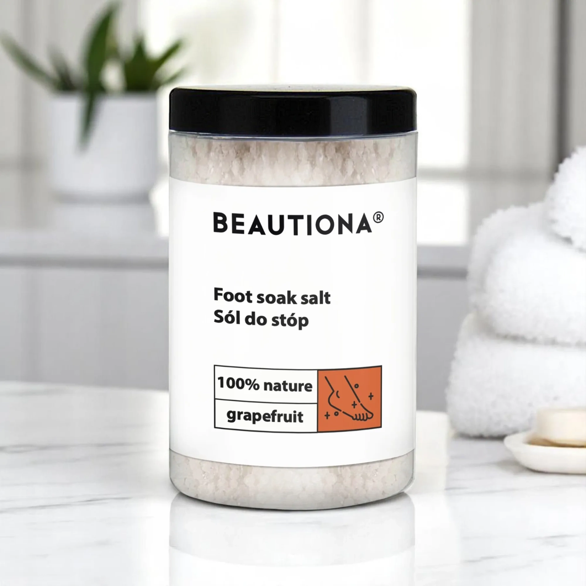 Zadbaj o swoje stopy z pomocą odświeżającej soli do kąpieli stóp z dodatkiem naturalnego aromatu grejpfruta.