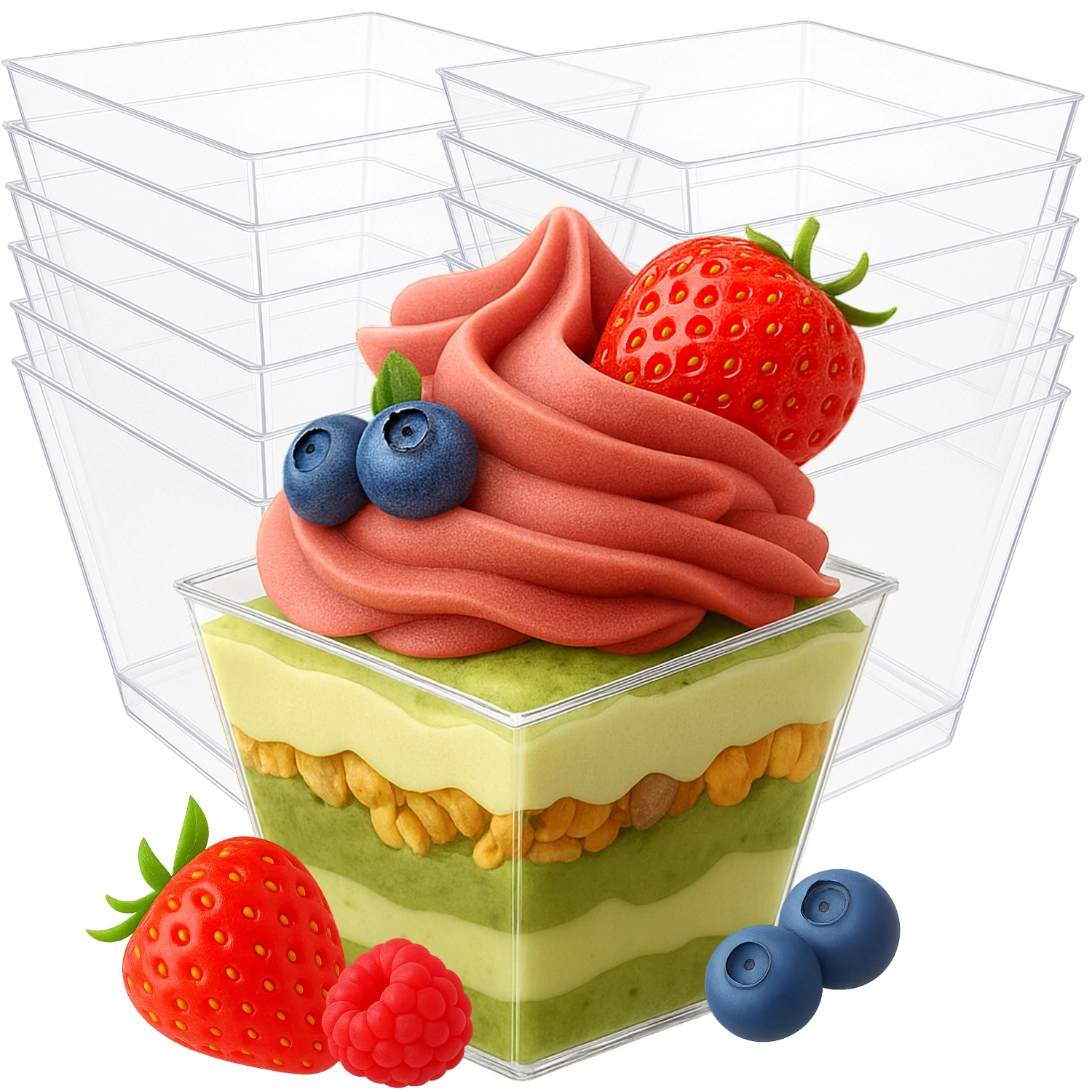 Przezroczyste pojemniczki deserowe doskonale sprawdzają się nie tylko do serwowania deserów, ale również przystawek, sałatek, dipów oraz innych małych porcji jedzenia. To wszechstronne rozwiązanie na przyjęcia, eventy i uroczystości. Materiał użyty do produkcji jest bezpieczny dla żywności i nie wpływa na smak ani zapach potraw, co pozwala zachować wysoką jakość serwowanych deserów.Przezroczysty plastik i elegancki kształt umożliwiają efektowną prezentację zawartości – każda warstwa deseru jest doskonale widoczna, dzięki czemu potrawy wyglądają jeszcze bardziej apetycznie. Idealne na wesela, bankiety, przyjęcia okolicznościowe oraz wydarzenia cateringowe, gdzie estetyka podania ma kluczowe znaczenie.