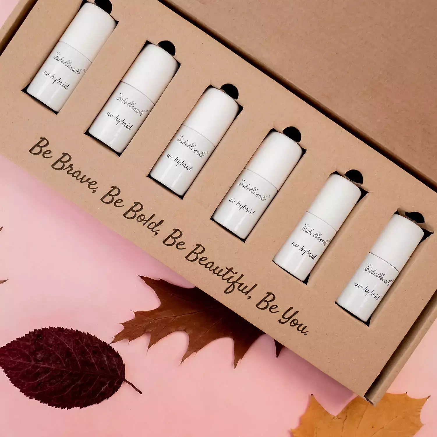 Przedstawiamy Ci nasz ECOBOX wypełniony sześcioma modnymi odcieniami lakierów hybrydowych isabellenails!