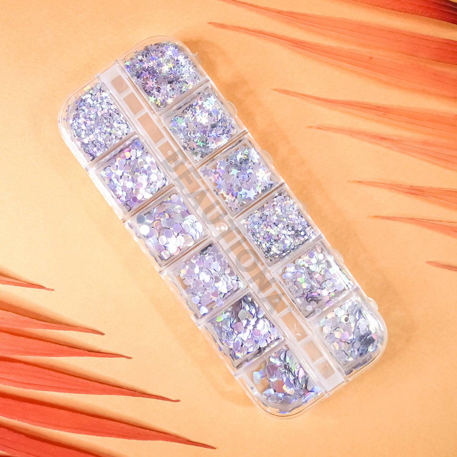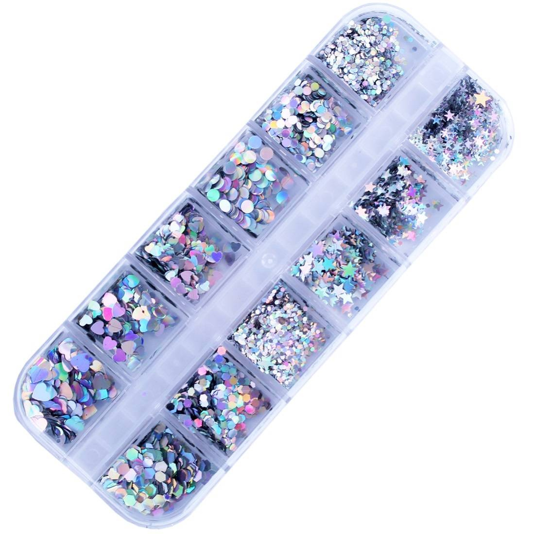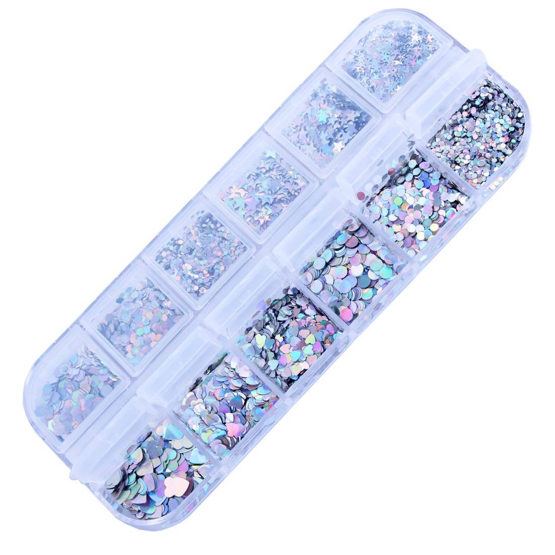 Hologramowe ozdoby w kasetce, w 12 różnych kształtach.