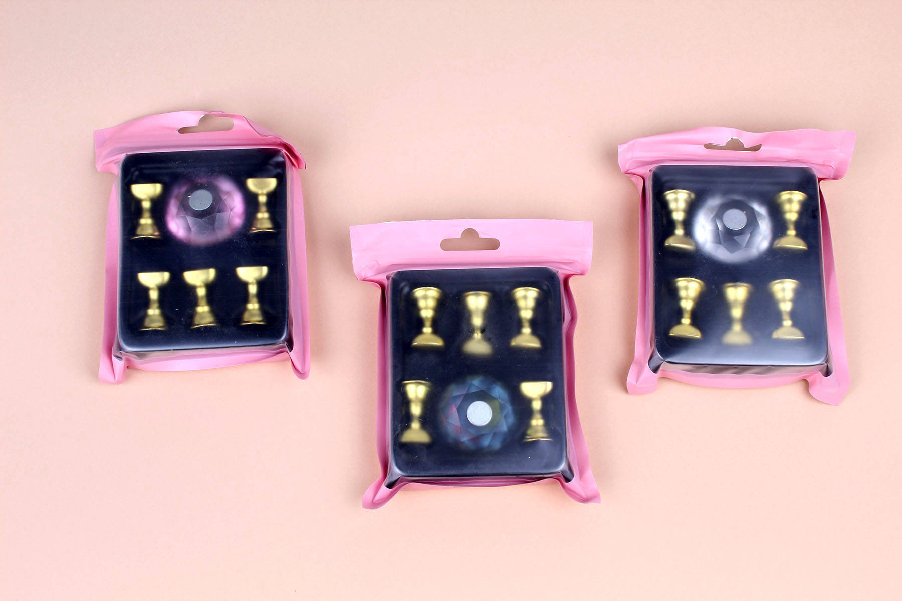 W skład zestawu wchodzi podstawka w kształcie diamentu + 5 stojaków na tipsy.