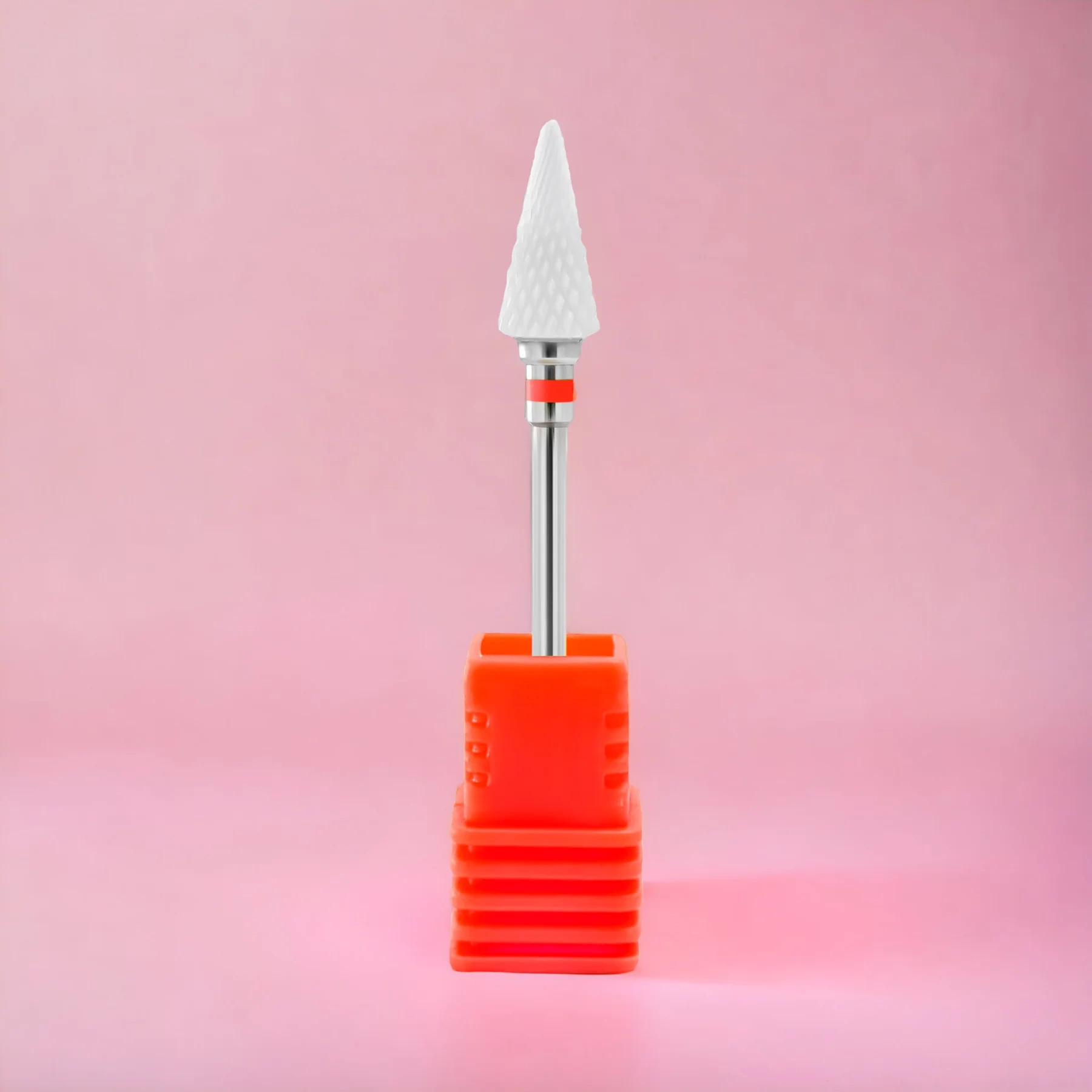 Ceramiczny frez do paznokci w kształcie stożka o delikatnej powierzchni ścieralnej.