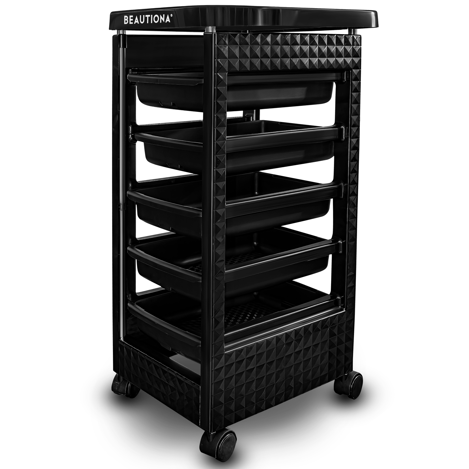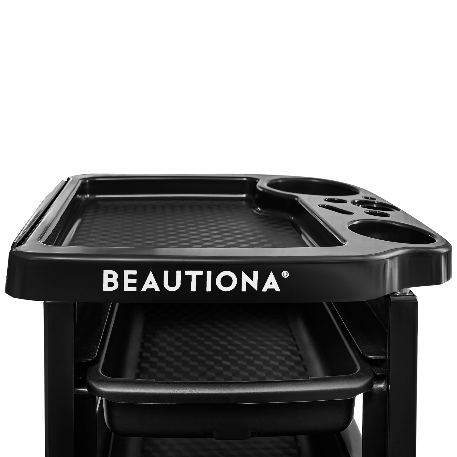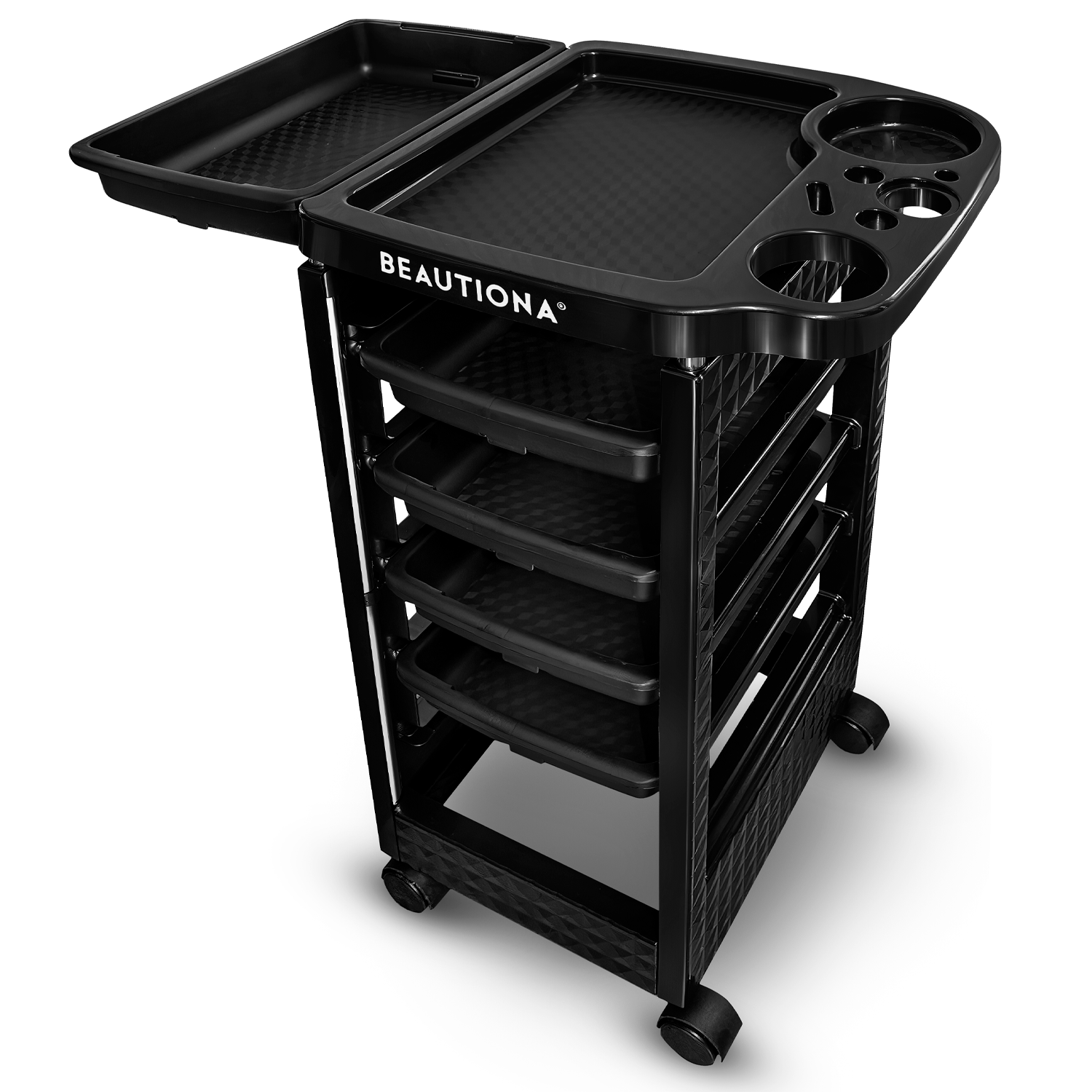 Posiada dodatkowe uchwyty na suszarki, nożyczki oraz szczotki fryzjerskie.