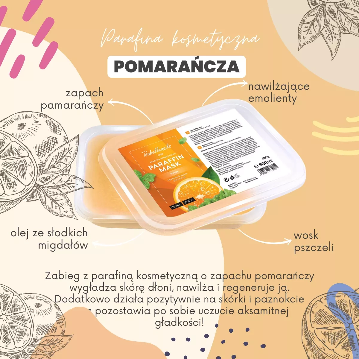 Zanurz się w świecie odprężenia z parafiną kosmetyczną isabellenails. Ten wyjątkowy produkt nie tylko otuli Twoje dłonie i stopy cytrusową świeżością pomarańczy, ale również zadba o ich głębokie nawilżenie i odżywienie.