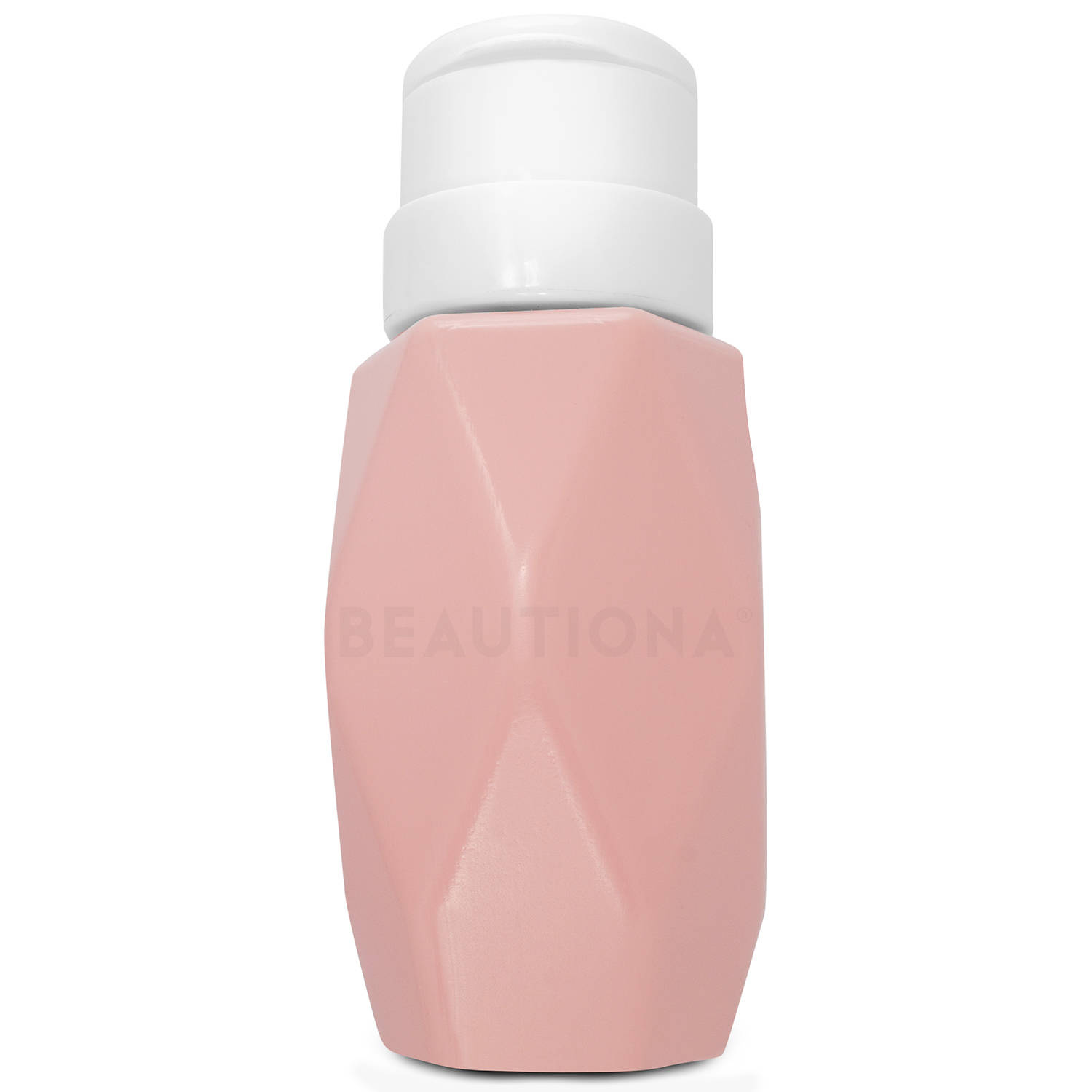 Pusta butelka w jasnoróżowym kolorze służąca do przechowywania płynnych preparatów do paznokci z wygodną, białą zatyczką.