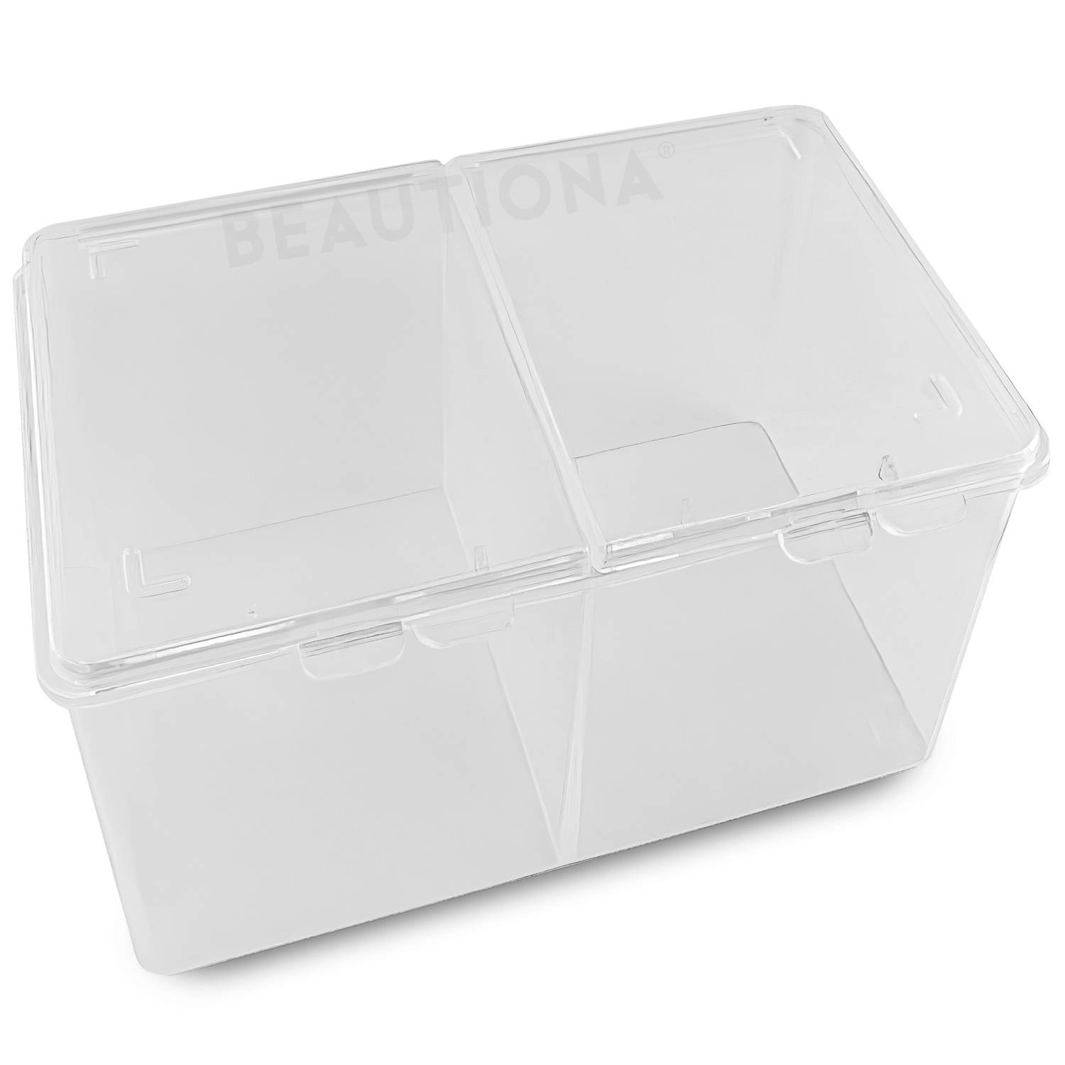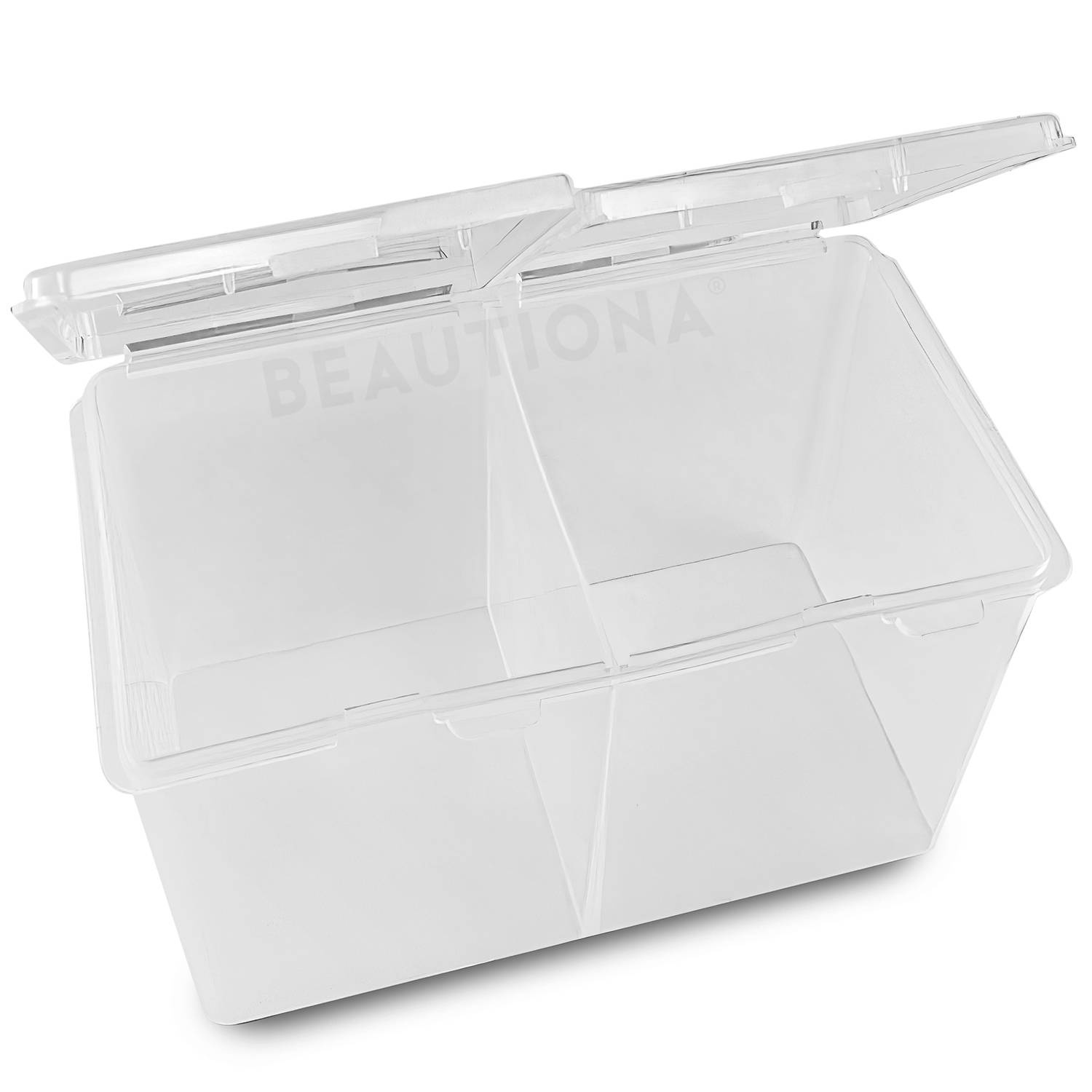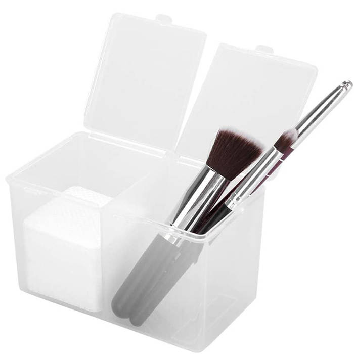 Uniwersalny dwuczłonowy pojemnik do przechowywania wielu kosmetycznych akcesoriów, pędzelków czy wacików do twarzy.